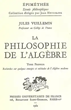 After studying at the École Normale Supérieure, he completed his agrégation in 1943, being received premier ex aequo alongside Tran Duc Thao. A student of French historical epistemologists Gaston Bachelard and Jean Cavaillès, he was however at first influenced by phenomenology and existentialism, before shifting towards study of logics and science. In 1962, he published a book titled The Philosophy of Algebra, dedicated to mathematician Pierre Samuel (a member of the Bourbaki group), René Thom, physicist Raymond Siestrunck,[6] and linguist Georges Vallet.[7] Vuillemin thought that renewals of methods in mathematics have influenced philosophy, thus relating the discovery of irrational numbers to Platonism, algebraic geometry to Cartesianism, infinitesimal calculus to Gottfried Wilhelm Leibniz. Furthermore, he observed that philosophy had not yet taken into account the changes brought to mathematics by Joseph Louis Lagrange and Évariste Galois.