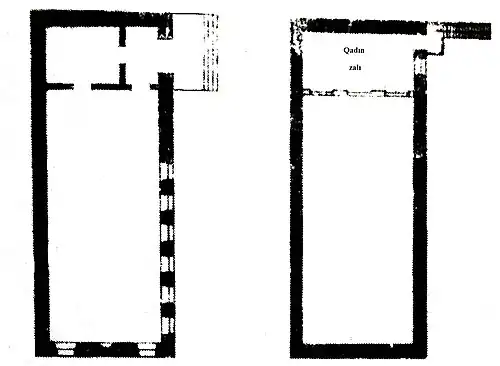 The Julfalar Mosque was one of the seventeen mosques functioning in Shusha by the end of the 19th century.[2] It was regarded one of the most valuable monuments of Shusha along with Yukhari Govhar Agha Mosque and Ashaghi Govhar Agha Mosque.[3] There were no minarets. The exterior design of Julfalar Mosque followed a rectangular plan neighborhood mosque building like Chukhur Mahalla and Haji Yusifli mosques but the interior completely complied with Islamic religious architecture.[4]