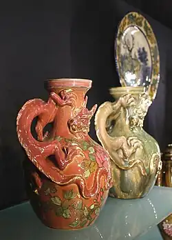 At the end of the 1880s, Julia's ceramic style reaches its peak in various decorative vessels - jugs with snake-shaped handles, modeled on forms from antiquity. .[4]