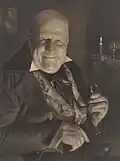 He was elected an honorary fellow of the Royal Photographic Society.[49] In his early history of the medium in Australia Jack Cato asserted that Smith "had no superior in any part of the world".[50] His portraits are in an outmoded Pictorialist style in a period of the emerging New Photography,[51][52] artistically lit with orchestrated, sometimes melodramatic, poses,[53] and printed with radical overexposure in pyrocatechin developer and bleaching-back with ferricyanide.[50] In his more contrived, but popular,[52] 'character study' tableaux the subject may be costumed as a protagonist from Dickens, Shakespeare, or from nursery rhymes.