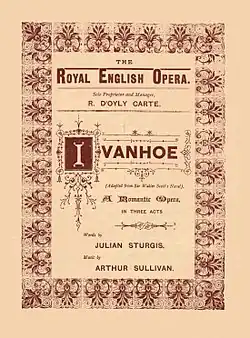 Throughout the 1880s, Sir Arthur Sullivan chafed at the restrictions of the comic operas for which he was famous. His friends and associates, and even the queen, encouraged him to write a serious opera.[16] His usual collaborator, W.S. Gilbert, declined to join him in writing a full-scale romantic opera, and recommended Sturgis as "the best serious librettist of the day".[17] The opera, Ivanhoe (1891), is an adaptation of Walter Scott's long patriotic novel of the same title. Most critics praised the libretto. Bernard Shaw was an exception, accusing Sturgis of "wanton debasement of a literary masterpiece", turning "Scott's noble dialogue" into "fustian".[18][n 5] The Times praised Sturgis's "remarkable fidelity and skill".[20] The Observer also found his work skilful.[21] The Manchester Guardian said that Sullivan was fortunate in his librettist, who "show[ed] himself capable of depicting ideas and events in a few words, and those words replete with rhythmical vigour and poetic beauty as well as significance of meaning."[22] Sullivan's friend the critic Herman Klein called the libretto "a skilful and fairly dramatic adaptation of Scott's novel and a polished example of poetic lyric-writing".[23] Although the opera was a success, initially running for an unprecedented 155 performances at Richard D'Oyly Carte's new Royal English Opera House, it passed into obscurity after the opera house failed.[24] It was, Klein observed, "the strangest comingling of success and failure ever chronicled in the history of British lyric enterprise!"[23]
