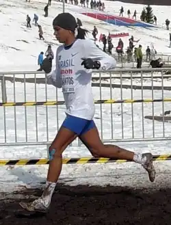 Santos made her first international appearance in cross country running at the 2013 IAAF World Cross Country Championships and on her first attempt placed 69th in the women's race. She ran a personal best of 16:56.73 minutes for the 5000 metres of the track that summer.[14] Two international medals came at the 2014 Ibero-American Championships in Athletics, held on her home area of São Paulo. She was the bronze medallist in the 1500 m and successfully stepped up a distance with a gold medal over 3000 metres.[15] In spite of this success, when it came to the national stage she was relegated to runner-up in both middle-distance track events, losing to Jessica dos Santos in the 800 m and Flávia de Lima in the 1500 m.[16]