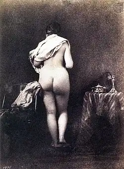 Realist painter Gustave Courbet was introduced to Vallou de Villeneuve's photographs by fellow artist Alfred Bruyas during the 1850s and used them as source material for his paintings,[12] in particular L'Atelier (1855) and Les Baigneuses (1853).[13] In 1954, the 27th Venice Biennale presented a large-scale retrospective devoted to Gustave Courbet;[14] one of the first major exhibitions devoted to the painter. Germain Bazin and Helene Adhémar (conservator, Department of Paintings at the Louvre) were the commissioners of ”A new century of vision[15]" which gave an essential place for artistic creations of the Second Empire. Jean Adhémar, curator, stressed that "first photographers are almost all painters, especially under Napoleon III". The section on “The times of Courbet, Manet, Nadar" was one of the richest in both the number of works presented - forty - and in the range of their subjects: it articulated the parallel between the realistic vision of the painter and the photographer. This was thus the first to attempt to identify the model in the nude photography requested by Courbet of Bruyas and mentioned for the first time by Pierre Borel in 1922.[16] A nude by Jacques Moulin (also exhibited) had previously been connected with the model in The Artist's Studio (L'Atelier du peintre): A Real Allegory of a Seven Year Phase in my Artistic and Moral Life (1855), by evoking the similarity of the models. But two photographs by Vallou Villeneuve, exhibited in the same section, where the model, Henriette Bonnion[17][18] poses in an attitude similar to that in Courbet's 'Bathers' (1853) and 'Artist's Studio' showed it likely (as subsequent studies have confirmed), that the Vallou model and not Moulin's was used by Courbet.[19][20]