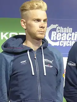 He made his first start at the Tour de France in 2015,[16] riding the race for each of his last three years with the team. In 2016, Vermote took his second career stage victory at the Tour of Britain, when he won stage two in Cumbria. Vermote had been a part of the breakaway, which was later joined by a group of overall contenders on the hilly route, before he was the only other rider to follow an attack by Steve Cummings on the run-in to Kendal.[17] Vermote pulled clear of Cummings on the final climb to the line, taking the leader's jersey as well as the stage win.[18] He held the race lead until the sixth stage, a summit finish at Haytor,[19] and ultimately finished the race in ninth place overall. The following month, he won a gold medal in the team time trial at the UCI Road World Championships in Qatar, riding as part of the Etixx–Quick-Step team.[20] Having extended his contract with the team for the 2017 season,[21] Vermote's best individual result was a fifth-place overall finish at the Tour of Belgium.