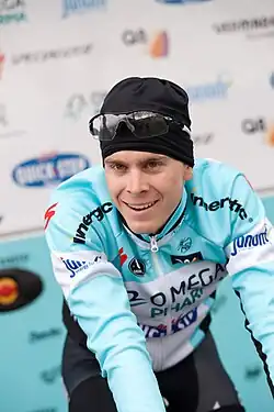 He took his first victory with the team in March 2012, when he took the general classification at the Driedaagse van West-Vlaanderen after teammate Michał Kwiatkowski withdrew from the race on the final day.[12] In 2013, Vermote won the GP Briek Schotte in September,[13] and recorded third-place finishes at the Belgian National Time Trial Championships and the Duo Normand two-man team time trial with Kristof Vandewalle.[14] At the 2014 Tour of Britain, Vermote won the seventh stage of the race, having made a solo attack from a five-rider breakaway group with around 17 kilometres (11 miles) remaining.[15] A week later, Vermote won a bronze medal at the UCI Road World Championships, as part of the Omega Pharma–Quick-Step squad riding in the team time trial.