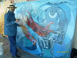 Over his career, he has created over 900 canvas works.[1] The first time his works were shown to the public officially was at a collective exhibition at Galería Yoca in 1973, with his first individual exhibition in 1977.[2] Since then, he has had over sixty individual exhibitions and participated in over 150 collective exhibitions in nineteen countries.[1] His works can be found in institutions and collections in most of the countries of the Americas and in Europe.[2]