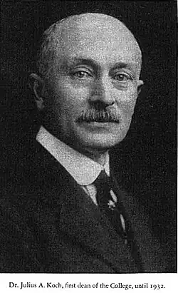 Julius Arnold Koch (August 15, 1864 – February 2, 1956) was an American chemist who was born in the Free Hanseatic City of Bremen. Koch graduated from the University of Pittsburgh in 1884. He was the first dean of the University of Pittsburgh School of Pharmacy and held this position until his 1932 retirement. In 1897, he discovered, together with Ludwig Gattermann, the Gattermann-Koch reaction—a method of synthesis of benzaldehyde using carbon monoxide.[1] He agreed to accept the status of dean only if the school's "sessions [were] changed from evening to the daytime."[2]