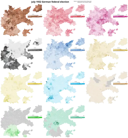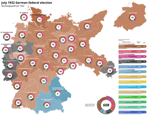 Federal elections were held in Germany on 31 July 1932, following the premature dissolution of the Reichstag.[1] The Nazi Party made significant gains and became the largest party in the Reichstag for the first time, although they failed to win a majority. The Communist Party increased their vote share as well. All other parties combined held less than half the seats in the Reichstag, meaning no majority coalition government could be formed without including at least one of these two parties.
