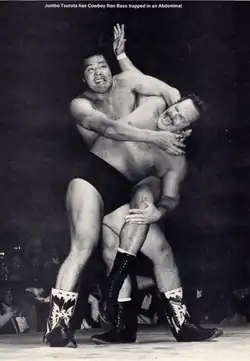 ![]() Jumbo Tsuruta (top) applies an abdominal stretch on Ron Bass (bottom), circa 1984 | |