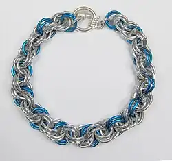 Jump rings are (usually metal) rings used to make chains, jewellery and chain mail. They are made by wrapping wire around a mandrel to make a coil, then cutting the coil with wire cutters to make individual rings. The rings can be assembled one by one into chains, earrings, objects such as bowls or ornaments, and chain mail clothing.[1]