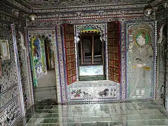 Over the course of several centuries, its walls were richly painted with murals; however, the earliest of these are unsigned.[9] During the reign of Maharawal Udai Singh II, several artistic works were undertaken at Juna Mahal.[9] From 1864 to 1875, an artist named Devji painted murals on its walls.[9] Later, from 1883 to 1886, the Nathu and Chhagan brothers from Udaipur were commissioned to repair and refurbish several areas of the palace.[9] Their work included the restoration of the Am Khas, a reception room, and the refurbishment of the Devji cut-glass inlay in the Shish ka Kamara, or glass room.[9] Their work was part of the preparations for the second marriage of Udai Singh's son, Khuman Singh, which occurred in 1886.[9] In later years, Udai's great-grandson, Maharawal Laxman Singh, invited two groups of artists from Nathdwara to work at Juna Mahal and decorate it.[9] In 1939, Laxman Singh called upon an artist named Kanhaiyalal from the Shrinathji Temple in Nathdwara to work at Juna Mahal.[9] Kanhaiyalal traveled to Dungarpur accompanied by another artist, Kajorimal.[9] During his time there, Kanhaiyalal primarily worked on the ground floor, including the Durbar Hall, Am Khas, and Shish ka Kamara, where he touched up and repaired damaged paintings.[9] In certain cases, he replaced the original murals with his own compositions.[9] The artwork at Juna Mahal is better preserved than that of any other palace in Rajasthan.[10]