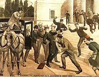 Theodoros Diligiannis, Prime Minister of Greece since December 29, was stabbed to death by a professional gambler, Antony Gherakaris, as he was entering the Hellenic Parliament house. Diligiannis had recently led the government in outlawing gambling houses in Greece.