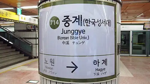 Junggye Station (Korean: 중계역) is a station on the Seoul Subway Line 7. Its name comes from Junggye-dong, where it is located, and means "in the middle of Hancheon".[1][2][3][4]