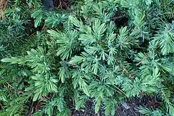 It is an evergreen coniferous shrub growing to a height of 1–3 m (rarely a small tree to 13 m tall). The leaves are needle-like, in whorls of three, light green, 7–14 mm long and 1-1.5 mm broad, with a double white stomatal band (split by a green midrib) on the inner surface. It is dioecious, with separate male and female plants. The seed cones are berry-like, green ripening in 18 months to reddish-brown with a variable light waxy coating; they are spherical, 8–10 mm diameter, and have six or nine fused scales in two or three whorls of three; the three larger scales each with a single seed. The seeds are dispersed when birds eat the cones, digesting the fleshy scales and passing the hard seeds in their droppings. The pollen cones are yellow, 5 mm long.[2][3]