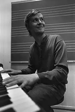 Well-known songs from the late 1960s and early 1970s included Suomi–Ruotsi ("Finland–Sweden") and the 1971 release Matkarakastaja ("Travelling Lover"), which met with criticism.[64] While Vainio's early albums were collections of singles, he recorded his first proper studio album in 1972.[65] The album Viisari värähtää ("The Pointer Twitches") included the song Kaunissaari (a reference to a place in Finland),[66] which Vainio recorded several times during his career.[67] It was also included on his next album, Tulin, näin ja soitin ("I Came, I Saw, I Played"), which was released in 1975.[66] Although Matkarakastaja and Viisari värähtää were Vainio's earliest published compositions, it was not until the late 1970s that he began to compose music more actively.