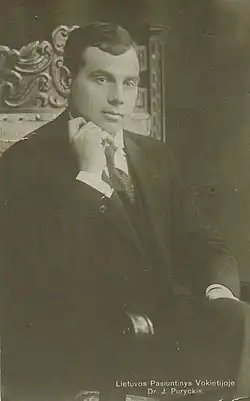 In Switzerland, Purickis joined Lithuanian cultural life and became a member of Rūta and Lituania student societies.[13] In December 1915, he became the secretary of the Central Committee for the Relief of War Victims in Lithuania, chaired by Bronisław Piłsudski. A number of Polish nobles belonged to the committee and soon Lithuanian representatives began clashing with them over the political issues of future independent Poland and Lithuania.[14] A particular issue was 50,000 Swiss francs raised by a Polish committee led by Henryk Sienkiewicz and Ignacy Jan Paderewski and sent to Vilnius. At least a third of the sum was supposed to be given to Lithuanian-speaking residents, but according to Swiss Lithuanians all of the money were used for Polish refugees. Therefore, Lithuanians decided to separate from the Central Committee and establish their own. They collected about 10,000 francs and sent to the Lithuanian Society for the Relief of War Sufferers.[15]