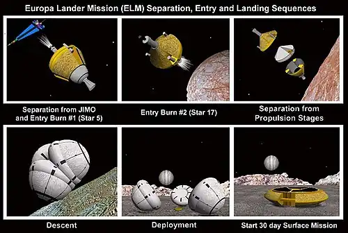 The Europa Lander Mission proposed to include a small nuclear-powered Europa lander on JIMO. It would travel with the orbiter, which would also function as a communication relay to Earth.[1] It would investigate Europa's habitability and assess its astrobiological potential by confirming the existence of water within and below Europa's icy shell, and determining its characteristics.[2]