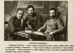 At the start of the Lithuanian–Soviet War, the Lithuanian government hastily organized defence. While the minister of defence Mykolas Velykis mistrusted Aukštuolaitis, the ministry hired Aukštuolaitis on 4 January 1919 as an officer of special affairs and two days later officially tasked him with the organization of a defensive battalion of Prussian Lithuanians and Samogitians in Tauragė.[8] The Lithuanian government initially envisioned Aukštuolaitis as a procurement agent, while the men would be commanded by officer Jurgis Kubilius.[9]