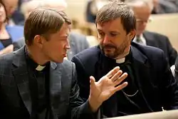 ![]() Juris Rubenis (left) discussing with Archbishop Jānis Vanags | |