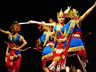 The dancers wear a female warrior costume, with their hair styled in a small bun adorned with a golden crown. The main attire consists of a short-sleeved blue shirt with gold embellishments, a belt, and a dodot, paired with knee-length trousers. The weapons include jemparing (bow and arrow), endhong (quiver), nyenyep (arrow), gendewa (bow), and cundrik (dagger).[3] The makeup serves to enhance the character and expression of a soldier's persona.[2]