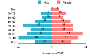 According to the 2002 Poland census, there were 527 people residing in Jurkowice village, of whom 49.9% were male and 50.1% were female. In the village, the population was spread out, with 26% under the age of 18, 40% from 18 to 44, 19.2% from 45 to 64, and 14.6% who were 65 years of age or older.[1]