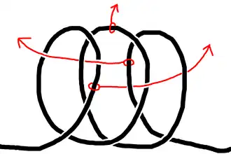 There are three closely related variations of this knot. They differ based on the type of crossing, overhand or underhand, of the three initial loops and then whether the edges of each loop is positioned over or under the previous one. Although these knots are tied in the bight, for the purposes of description the left side will be considered the standing part. If all the crossings and overlays are reversed, or the right side is taken as the standing part, a mirror image of the knot will result.