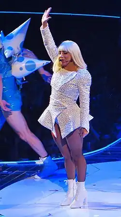 On February 5, 2017, Gaga performed "Just Dance" during the Super Bowl LI halftime show.[87] She was wearing a spicy gold jacket and played on a keytar, while one of her dancers held the microphone for her.[88][89] In the same year, the song was added to the setlist of Gaga's two shows at the Coachella Festival, where she was one of the headliners.[90] On the Joanne World Tour (2017–2018), Gaga wore a pearl-encrusted pale blue bodysuit with dramatic shoulder pads, and knee-high lace up boots while performing the track.[91][92] "Just Dance" served as the opening song of the singer's Las Vegas residency, Enigma (2018–2020). During the performance, Gaga descends from the ceiling in a harness and a sequined jumpsuit while playing on a keytar.[93] In 2022, she performed "Just Dance" at The Chromatica Ball stadium tour.[94]