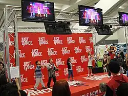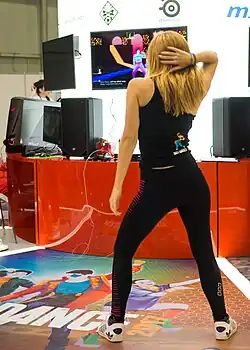 Just Dance is a rhythm game series developed and published by Ubisoft, beginning with the original game in 2009.[2] The games feature of a variety of songs that are accompanied with choreography performed by on-screen dancers. Players physically mimic the dance routine shown on screen and are scored based on how accurately they followed. The series has attracted popularity among a wide age range and dance skill level, and has been played in various contexts, such as entertainment, fitness and education.[3]