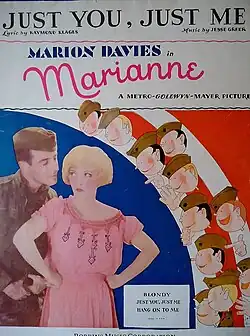 "Just You, Just Me" is a song from the 1929 musical film Marianne, composed by Jesse Greer with lyrics by Raymond Klages.[1] It was introduced by Marion Davies and Lawrence Gray. The song has had many revisions after its first appearance and has become a jazz standard,[2] having been recorded instrumentally by Red Norvo, Stan Tracey, Oscar Peterson and Lester Young, Buddy Rich, Artie Shaw, Les Paul, Benny Carter, Buddy Bregman, Tex Beneke, Coleman Hawkins, Harry James, Erroll Garner, Benny Goodman, Earl Hines, Joe Pass, Buddy Tate and Abdullah Ibrahim, Les Brown, Bill Evans, Bill Coleman and Duke Ellington.