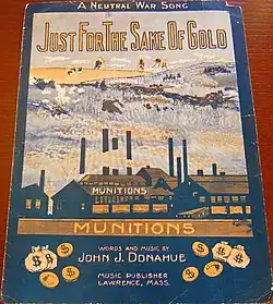 "Just for the Sake of Gold" is a World War I era song released in 1915. Lyrics and music were written by John J. Donahue. The song was published by Donahue Music of Lawrence, Massachusetts. On the sheet music cover is a battle scene taking place behind a munitions factory.[1]
