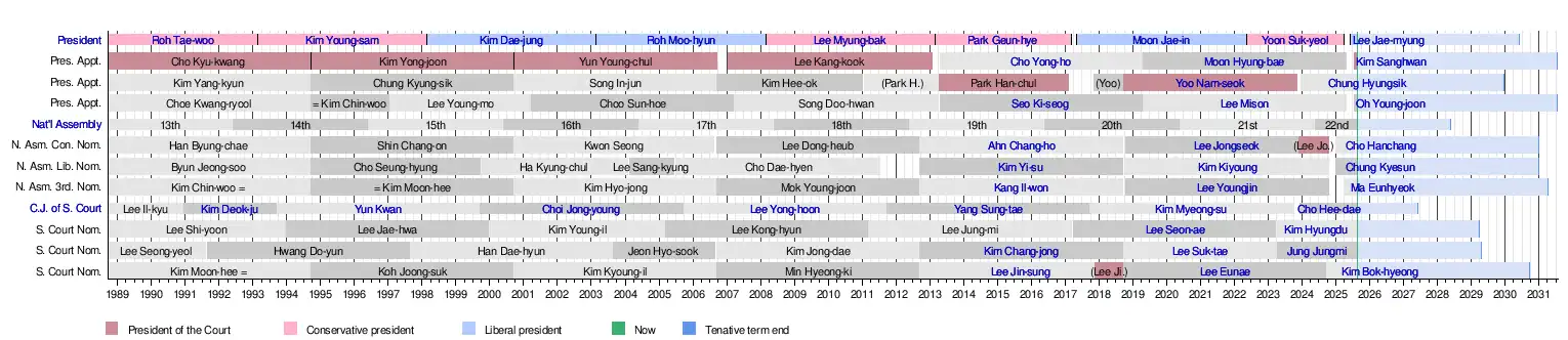 - ^ Also see the "Chronological Table" tab for a timeline of Justices. "Constitutional Court of Korea > Constitutional Court of Korea > About the Court > History". english.ccourt.go.kr. Archived from the original on 2025-05-12. Retrieved 2025-08-15.