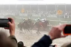 The track conditions for the 2018 Preakness Stakes, run on May 19 at Pimlico Racetrack in Baltimore, were even worse than for the Derby.[39] After heavy rain over several days, the track was sloppy.[40] The rain finally stopped shortly before the race but then a heavy fog descended, limiting visibility to about a sixteenth of a mile.[41]