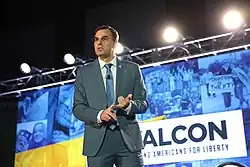 Amash has described himself as a libertarian, dissenting from both Republican and Democratic leadership more frequently than the vast majority of Republican members of Congress.[78][79][80] Amash was regarded as one of the most libertarian members of Congress, receiving high scores from right-leaning interest groups such as the Club for Growth, Heritage Action, and Americans for Prosperity, and praise from limited-government think tanks and nonprofit organizations.[81][82][83][84] He was a founding member of the House Freedom Caucus,[62] a group of conservative Republicans in the House.[85][62] In June 2019, Amash left the caucus.[86] On July 4, 2019, he announced that he was leaving the Republican Party to become an independent.[87] He officially announced his membership in the Libertarian Party in April 2020.[88]