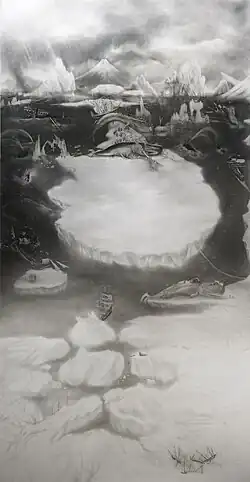 In 2008 Justin Storms graduated from Maryland Institute College of Art and attended the Triangle Artist Workshop in Brooklyn, NY.[6] In 2008 he was invited to attend the University of Berlin's "Karl Hofer Gesellschaft,"[7] where he exhibited work for the emerging art fair: "Preview Berlin" which was held at the historic Berlin Tempelhof Airport. In 2009, he was awarded Switzerland's "AKKU" residency,[8] located outside of Zurich from 2009-2010. He was commissioned to press 50 copies of the "Whaletopian Coloring Book" by AKKU. In 2010 he was invited to attend the Triangle International Residency in Brooklyn, NY.