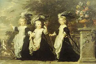 His early portrait paintings show the influence of van Dyck. An example is the portrait of Portrait of Marie Louise Gonzaga (1645, National Museum, Warsaw) which is very Vandyckian in the straddling position of the sitter, the gesture of her hand, the profiling of the body and the facing of the face toward the viewer. In the early 1650s he completed a series of very large portraits for Gaston, Duke of Orléans that were installed at the Palais du Luxembourg (now in the Château de Balleroy (Calvados)) and reference Rubens' style.[3] In his later career he was able to synthesize the influences of Rubens and van Dyck as is shown in the group portrait of the three children of the Goubau family.