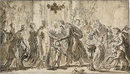 Van Egmont was an accomplished draughtsman whose compositions are very minimal and striking. His rough sketches are characterized by the angularity of the facial features of the figures and the use of many lines.[3] An example is the drawing entitled The Marriage of Zenobia and Odenatus (Art Institute of Chicago), which was a preparatory drawing for the tapestry series, Life of Zenobia, Queen of Palmyra. In this sketch executed in chalk van Egmont has laid out the broad composition in quick strokes. The drawing reveals van Egmont's ability to characterize the figures in their proportions and pose with a few sure strokes. Also striking is the carefully balanced direction of the lighting, which binds the drawing style and the dynamic movement of the figures together in a spatially closed scene in which the main characters are clearly emphasized.[9]