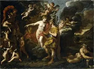 After a stay in Italy in 1618,[6] van Egmont returned to Antwerp and worked in the workshop of Rubens from the year 1625 (but possibly already starting from 1622) to about 1628, where he was involved in the series of paintings on The Life of Maria de Medici. He became a master of the Antwerp Guild of St. Luke in 1628.[7] While living in Antwerp, he had a relationship with Emerentia (Emerentiana) Bosschaert who bore him three sons out of wedlock: Joost (Justus), Konstantijn (Constantine) and Theodoor (Theodore) who were born between 1623 and 1627. Their relationship was later regularized and the couple would have more children including sons Bonaventura and Philippe and daughters Prudentia, Marie and Anna Catharina.[4] Van Egmont's children trained as painters and are believed to have worked in the workshop of their father at one time or the other. However, none of them would achieve the same level of success as their father.[7]