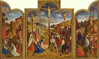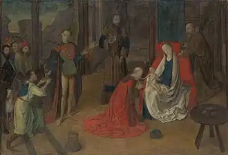 Two works from the time before he left for Italy have been preserved: the monumental Crucifixion Altarpiece or Calvary Triptych (in the Saint Bavo Cathedral, Ghent) and the Adoration of the Magi (Metropolitan Museum of Art, New York). The latter painting was possibly commissioned for a convent near Burgos in Spain. For this reason the picture was painted on canvas so it could be rolled up for easy transport. The stage-like space and arrangement of the main figures in two parallel diagonal lines seem to suggest an inspiration by theatre reenactments of the story of the Epiphany.[4] Both these early paintings are characterized by monumentality. The facial features of the figures and colour spectrum are closely related to the oeuvre of Hugo van der Goes. The two masters likely worked together before van Wassenhove left for Rome. There is also a relationship with the work of Dieric Bouts.[3]