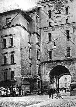 The tower remained virtually unchanged over the following centuries, though the attached house was renovated and gained two additional stories between 1794 and 1805. In 1903 and 1933 the west facade of the tower was renovated. The east facade was renovated in 1906. To ease traffic congestion, a second walkway was cut through the house north of the tower in 1886. Then, in 1902-3 a large gate was built through the ground floor cell block of the prison. The 60 to 70 prisoners that had been housed in the tower, were moved to the district prison north of the main post office building in 1897. Removing the prisoners and demolishing the cells changed the role of the tower. It became an archive tower and stored the state archives of the canton and the records of the supreme court.[6] For a time a portion of the basement served as a warehouse of the adjacent Garnier wine shop.[7]
