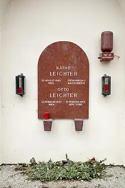 When the SDAPÖ was banned in Austria in February 1934, Leichter joined the Revolutionäre Sozialisten (Revolutionary Socialists), an underground socialist organisation that had been formed in response to the party ban.[2] She and her husband Otto migrated to Zürich in exile for six months in 1934, but returned to Vienna when she was elected the Revolutionary Socialists' chair of education. She wrote anti-fascist pamphlets and published articles abroad under the pseudonyms Maria Mahler and Anna Gärtner.[3] After the Nazi Party invaded Austria in the 1938 Anschluss, she attempted to flee Austria with her family; although her family escaped, Leichter was arrested by the Gestapo in Vienna on 30 May 1938 and subsequently imprisoned. She was sent to Ravensbrück concentration camp in 1940 and was killed by gas at the Bernburg Euthanasia Centre in early 1942.[2] An urn at Feuerhalle Simmering filled with earth from Ravensbrück concentration camp serves as her cenotaph in Vienna.