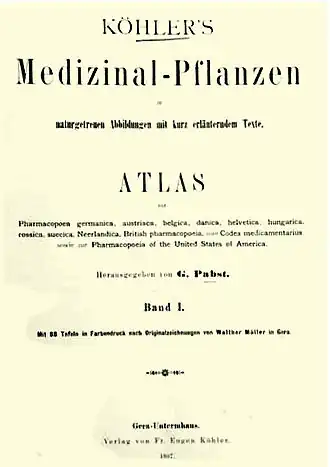 Köhler's Medicinal Plants (or, Köhler's Medizinal-Pflanzen) is a German herbal written principally by Hermann Adolph Köhler (1834–1879, physician and chemist), and edited after his death by Gustav Pabst. The work was first published in the late 19th century by Franz Eugen Köhler of Gera. Its complete title is Köhler's Medizinal-Pflanzen in naturgetreuen Abbildungen mit kurz erläuterndem Texte : Atlas zur Pharmacopoea germanica, austriaca, belgica, danica, helvetica, hungarica, rossica, suecica, Neerlandica, British pharmacopoeia, zum Codex medicamentarius, sowie zur Pharmacopoeia of the United States of America.
