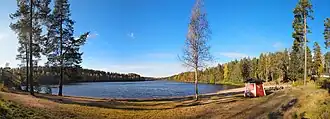 There are multiple smaller lakes or ponds within the catchment area, including Soidenlampi, Mustalampi and Kotalampi in the south as well as Rimminlampi, Killervä and Riihilampi in the north.[5][6] Köhniönjärvi itself discharges into the Jyväsjärvi via the 3.8-kilometre (2.4 mi) long[1] Köyhänoja, which follows the Haapamäki–Jyväskylä railroad for much of its course, also passing through the residential areas of Tarhamäki and Kukkumäki.[3]