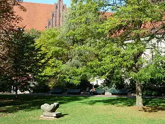 In 1858/59 Inselstraße was extended through the garden to connect Köpenicker Straße to the city centre, and the Lodge was forced to sell the larger, eastern portion of the site to the city. The Köllnisches Gymnasium was then built there.[10] How to use the remainder of the site was discussed for years; a desire to preserve the trees led to the rejection of several commercial proposals.[10] On 15 April 1869, the Assembly of City Deputies (Stadtverordnetenversammlung) decided to establish a public playground (probably one of the first in the city) and 'promenade location' there on plans drawn up by the first city director of gardens, Gustav Meyer, dedicated the necessary funds, and urged rapid execution of the plan.[1][11] The plan involved some new plantings, fencing, and benches. This renovation was completed in 1873. The park reached its current dimensions in 1883 after the ditch was filled in.[12] Ludwig Hoffmann, the architect of the Märkisches Museum (completed in 1907), then made some changes, including creating views across the park to the new museum.[1] The last major modification of the park took place in 1969–71 to designs by Eberhard Jaenisch, Stefan Rauner and Roswitha Schulz:[12] a mound which remained on the site of the bastion was levelled, a children's playground was added, a terrace was built behind the museum, and the Lapidary was created.[1][2]