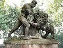 - a larger-than-life sandstone sculpture of Hercules fighting the Nemean Lion, at the eastern entrance to the park,[1] was modelled in 1787 by Gottfried Schadow and executed in 1791 by Conrad Nicolas Boy. The work originally decorated a bridge over the Königsgraben, was moved in 1891 to the Herkulesbrücke (Hercules Bridge) over the Landwehr Canal. It was placed in storage in 1934 before being installed in the park in 1971.[14]