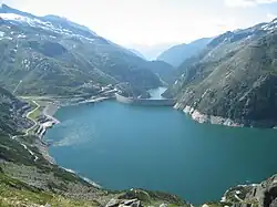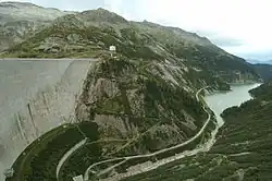 The Kölnbrein Dam is an arch dam in the Hohe Tauern range within Carinthia, Austria. It was constructed between 1971 and 1979 and at 200 metres (660 ft) high, it is the tallest dam in Austria.[1] The dam's reservoir serves as the primary storage in a three-stage pumped-storage power system that consists of nine dams, four hydroelectric power plants and a series of pipeline and penstocks. The complex is owned by Verbund power company and is referred to as the Malta-Reisseck Power Plant Group. The installed capacity of the group is 1,028.5 MW and its annual generation is 1,216 gigawatt-hours (4,380 TJ).