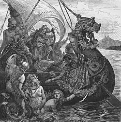The theme of König Rother is the "dangerous bridal quest".[5] Traditionally classified as a Spielmannsdichtung,[6] today it is more often labelled "pre-courtly epic".[3][7] The story is probably based on orally transmitted accounts of historical events, but its treatment is entirely fictional.[3][7] King Rother, for example, may be a reflection of King Rothari or King Roger II of Sicily, both of whom ruled in Italy.[8] In the story, Rother, whose capital is Bari, needs a wife to ensure his succession. He pursues the daughter of Emperor Konstantin of Constantinople, who has the habit of executing her suitors. Rother outsmarts the emperor and takes the girl back to his kingdom, but her father's sends a ship to take her back. In a second effort, Rother goes in disguise to Constantinople, but is identified and sentenced to death.[6] He is saved by a pre-planned military intervention and finally receives his bride.[9]