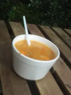 Köttsoppa (Swedish: [ˈɕœ̂tːˌsɔpːa]; Finnish: lihakeitto [ˈlihɑˌkei̯tːo]; both lit. 'meat soup') is a clear meat and root vegetable soup eaten in Sweden and Finland. The meat, and the bones supplying the broth, is beef (frequently chuck), or sometimes pork, reindeer or moose. Vegetables commonly used include carrot, potato, celeriac, parsnip, turnip and rutabaga. Green peas and white cabbage is also common. Leek, peppercorns and bay leaves are often added for seasoning. Meat and vegetables are cut to roughly die-sized bits and boiled soft. An Icelandic variety, called íslensk kjötsúpa, typically has lamb with potatoes, carrots and cabbage.[1]