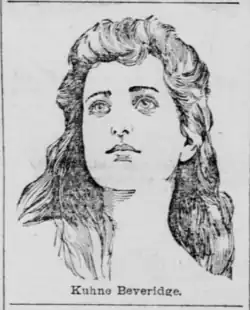 In 1893, she married actor Charles Francis Coghlan, who was nearly 40 years older than her.[2] She soon discovered that he had a living common-law wife at the time of her marriage and obtained a divorce for desertion when Coghlan returned to live with the woman.[3] Before she went to South Africa, Beveridge had executed several commissions for Cecil Rhodes and others living in that region. Beveridge received an Honorable Mention in the 1900 Paris Exposition.[4] With the help of her mother, she also made a statue The Veiled Venus for the Paris Exposition,[5] which was awarded a bronze medal at the Paris Salon and was placed in Leeds Museum, England[6] She also made San Francisco weeping at the Golden Gate for the San Francisco Golden Gate Park.[7]