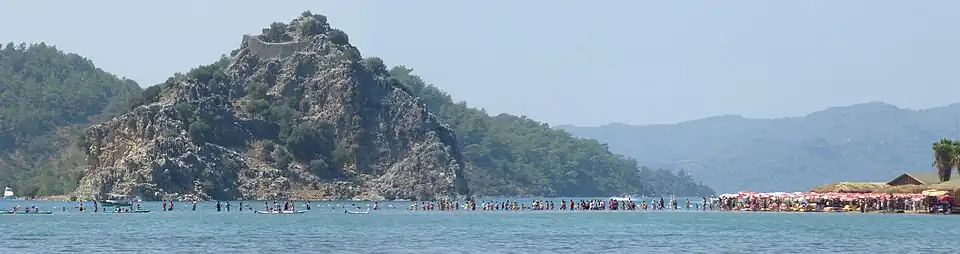 Kızkumu is an area of 600 metre shallow water that divides this bay of Turkey into two and is part of Orhaniye District of the city Muğla in Turkey. According to the legend, a girl who wants to reach her lover fills her skirt with sand and start moving ahead in the sea by filling the sea with her sand. But she was drowned when she ran out of sand. Just at the beginning point of the shallow water area, there is a sculpture of this girl.