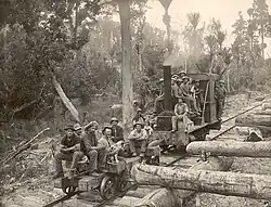 Logging played only a secondary role in the area, but mines needed kauri timber both for construction and for heating the ore ovens. Local loggers thus operated a narrow gauge logging railway including a small steam engine.[6]